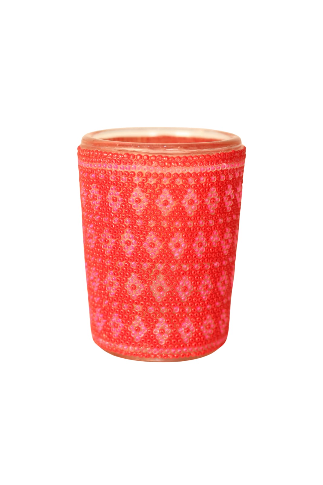Mezcalero  de vidrio decorado a mano con arte wixárika. Belleza, elegancia y arte mexicano en cada pieza.